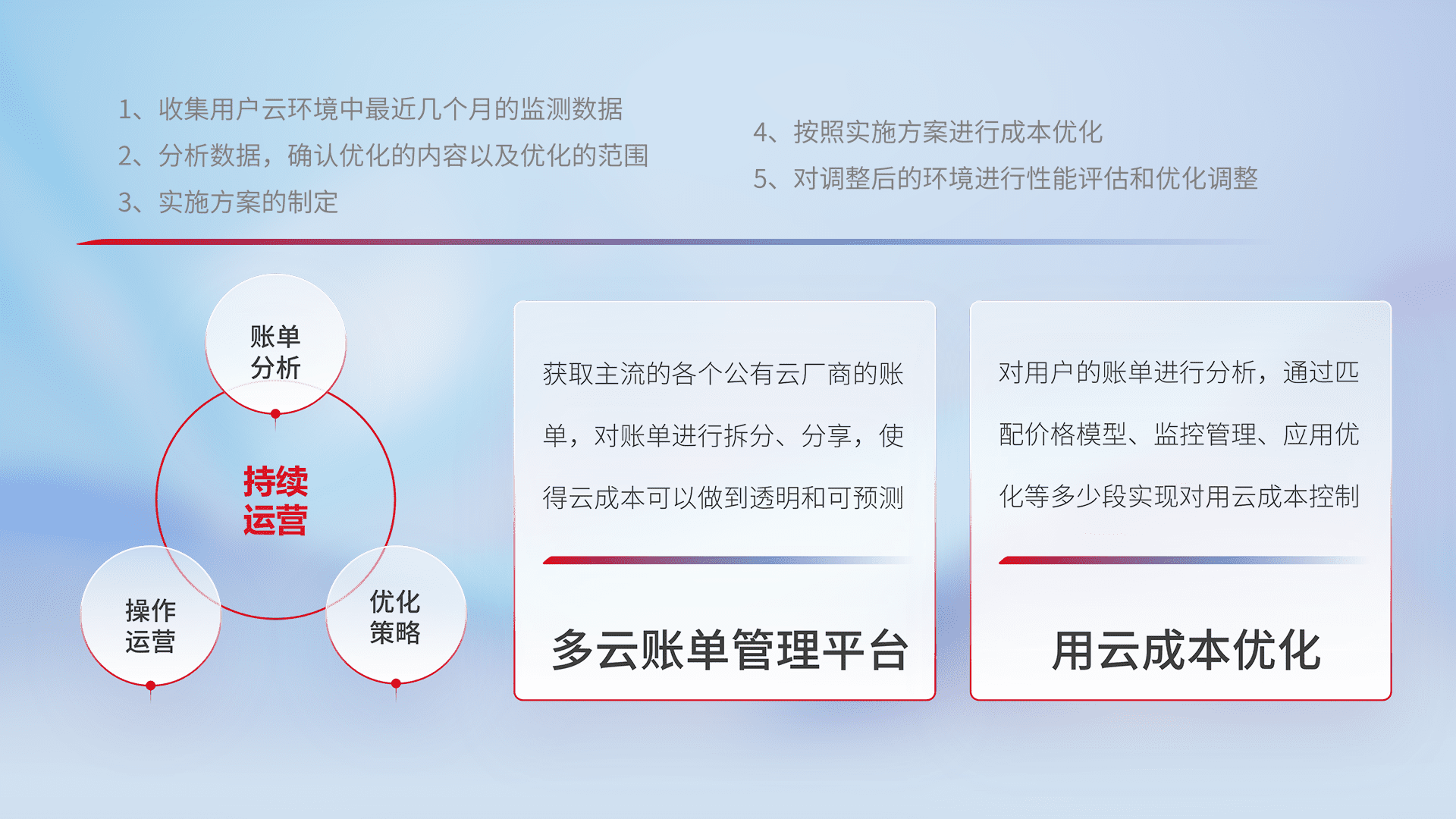 通过多云纳管,,,以统一的资源数据模型把客户的云资源进行抽象和封装,,进而实现对多云资源的统一操作,,,保障云资源管理的可靠性、、稳定性与可用性。。量身定制化运维内容,,,,配置、、、开发运维、、、补丁管理、、、、备份、、、监控、、认证和访问管理、、审计和日常巡检等,,,,保障在用云过程中的可靠度,,,稳定度以及高可用率。。。。